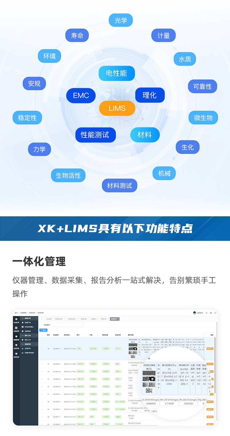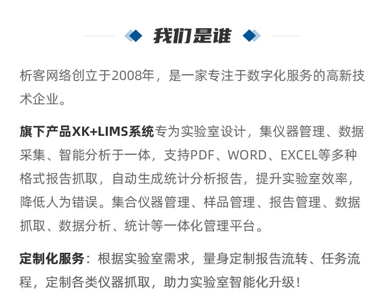 旗下产品XK+LIMS系统专为实验室设计,集仪器管理、数据采集、智能分析于一体,支持PDF、WORD、EXCEL等多种格式报告抓取,自动生成统计分析报告,提升实验室效率,降低人为错误。集合仪器管理、样品管理、报告管理、数据抓取、数据分析、统计等一体化管理平台;