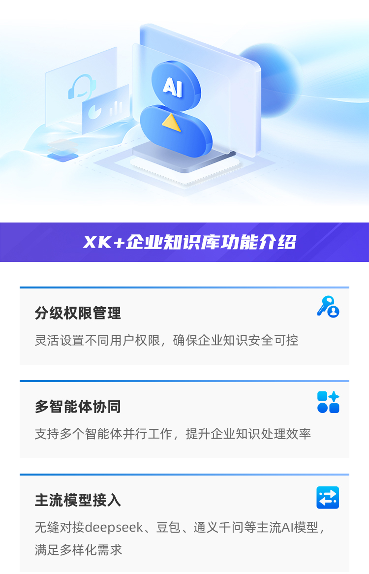 XK+企业AI知识库是一款融合AI的知识管理平台,支持AI问答、分级权限、多智能体协同和主流AI模型接入,提供知识库管理、优化及智能问答功能;助力企业实现知识高效整合、提升团队协作效率,降低运营成本。