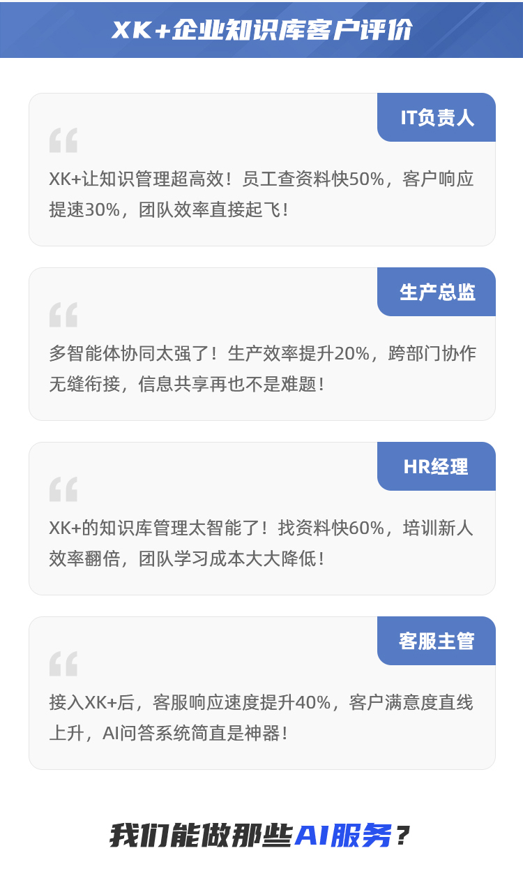 “接入XK+后,客服响应速度提升40%,客户满意度直线上升,AI问答系统简直是神器!”