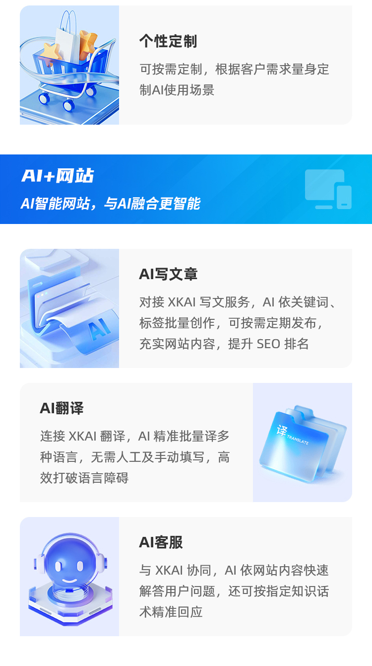 l AI 客服:与 XKAI 协同,AI 依网站内容快速解答用户问题,还可按指定知识话术精准回应。